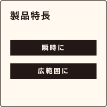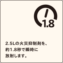 容器に充填されている2.5Lの火災抑制剤を、マニホールドキャップの全面に装着された2つの放射ノズルから約1.8秒という瞬時に最大10m2(6畳間)という広範囲に、大きな音も強い反動もなく放射することができます。