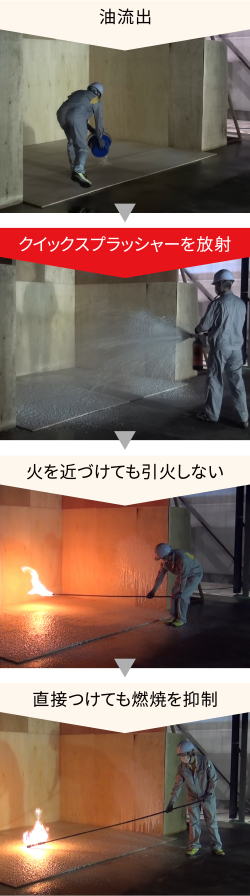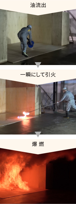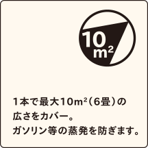 不慮に燃料が流出してしまうような様々な場面において、安全性の向上が期待できます。例えば、ガソリンスタンドや交通事故現場などで、燃料が漏れてしまった場合、すぐに当製品を放射しておけば、着火を抑えることができ、安全に回収処理や救助作業が行えます。