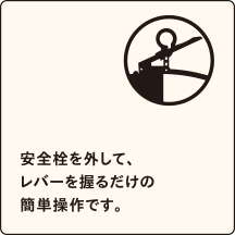 火災抑制剤は、消火器用の消火薬剤を規格に準じた性状を有しており、安全性や長期安定性に優れたものです。容器は、十分な耐圧性能を有する実績がある消火器容器を採用しています。また、操作機構である安全栓、ハンドルレバーも消火器と同じ機構になっています。