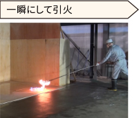 火災抑制剤を常温(20℃)で約1.8秒で最大10m2の範囲放射できます。放射された火災抑制剤は、ガソリン等の可燃性液体の上に拡がり、泡や水成膜が油面を覆うことにより、ガソリン等の可燃性ガスの蒸発を抑制することができます。